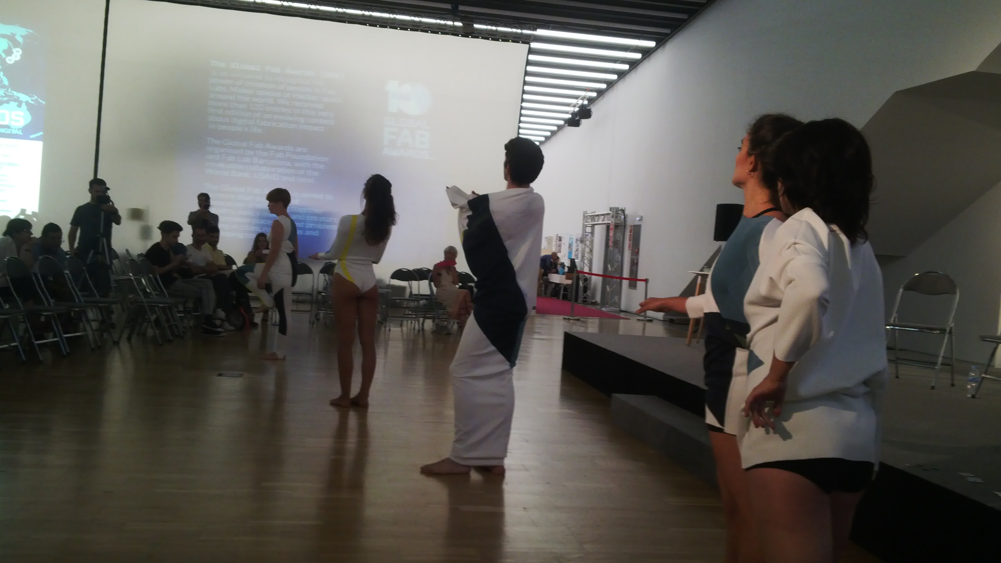 Saturday closed with the marvelous digital couture showcase of Fab Textiles + EASTN. Anastasia Pistofidou from Fab Lab Barcelona presented a selection of skillful creators that combine fashion design, technology and wearables. The showcase ended with a performance by Wearable Fashion Orchestra, an amazing dance show where music was generated by the movement of dancers wearing smart clothes.
